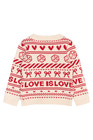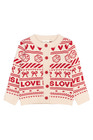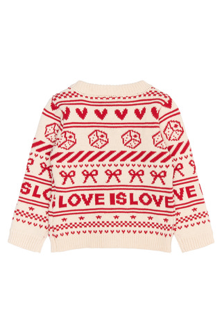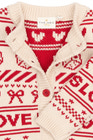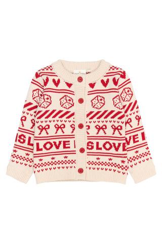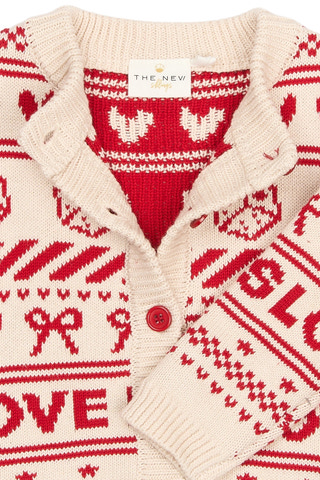 Denne cardigan fra THE NEW Siblings er både hyggelig og festlig – perfekt til sæsonens varme og kærlige stunder. Den er strikket med et charmerende jacquardmønster, der inkluderer hjerter, sløjfer, terninger og ordet "LOVE", hvilket skaber et legende og kærligt look. Cardiganen har ribkanter og en knaplukning foran, som gør den nem at tage på og af.