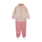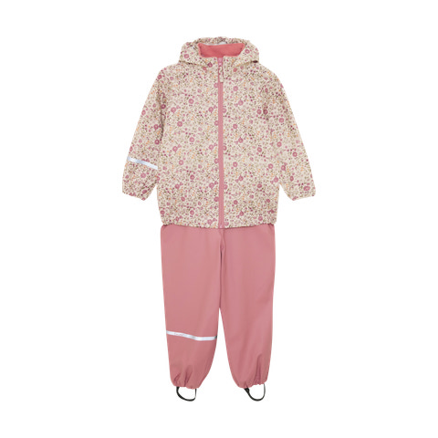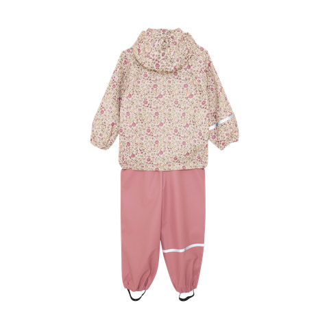 Praktisk regnsæt i PU fra CeLaVi. Sættet består af en regnjakke med all‑over print samt en ensfarvet regnbuks. Bukserne har justerbare seler og klikspænder op til størrelse 110; i større størrelser leveres de uden seler. De er desuden udstyret med justerbare elastiske fodstropper, som kan placeres under fodtøjet.