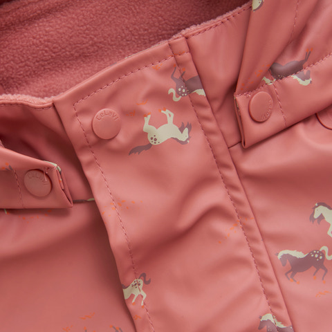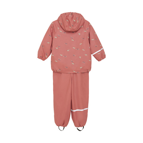 Sættet består af en regnjakke med all-over print og ensfarvede regnbukser. Til og med størrelse 104 er regnbukserne lavet som smækbukser med justerbar seler og plastspænde fortil. De kan lukkes i siden med en praktisk trykknap. Fra størrelse 110 og op er bukserne lavet som bukser med elastik i taljen. Begge udgaver har justerbar elastiske fodstropper, der kan puttes under støvlerne, så de ikke kryber op af benet. Regnjakken åbnes fortil med kvalitets lynlås med hagebeskytter og dobbelt vindstolpe, hvoraf den udvendigt lukkes med praktiske trykknapper. Hagebeskytteren sørger for, at lynlåsen ikke generer under hagen. Jakken har aftagelig hætte og elastik ved ærmernes afslutning. Både jakke og bukser har blødt fleecefor samt refleksdetaljer. Der er navneskilt indeni.