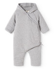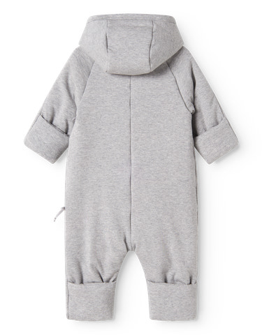 Varm vatteret heldragt med hætte og slå-om-lukning. Heldragten bliver lukket med trykknapper og bindebånd. Heldragen har smart ombuk mulighed på både hænder og fødder for at holde den lille varm.