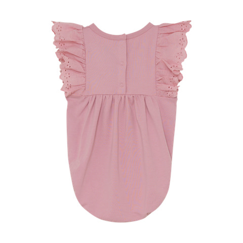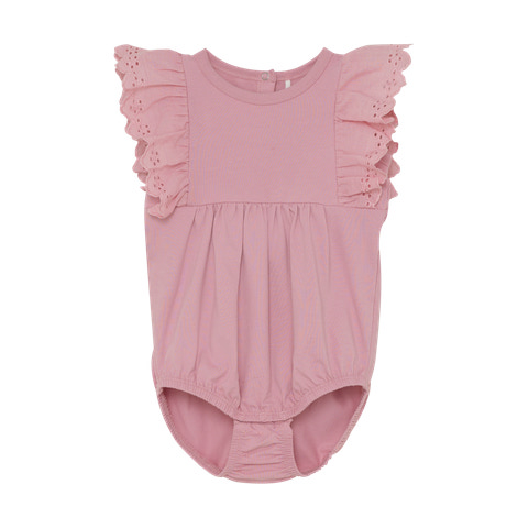 Romper fra En Fant er en sød og behagelig dragt til de mindste – perfekt både til hverdagen og til finere anledninger. Dragten kommer i en smuk rosa farve og er pyntet med fine flæser og broderidetaljer på skuldrene, som giver et elegant og feminint udtryk.