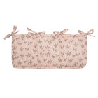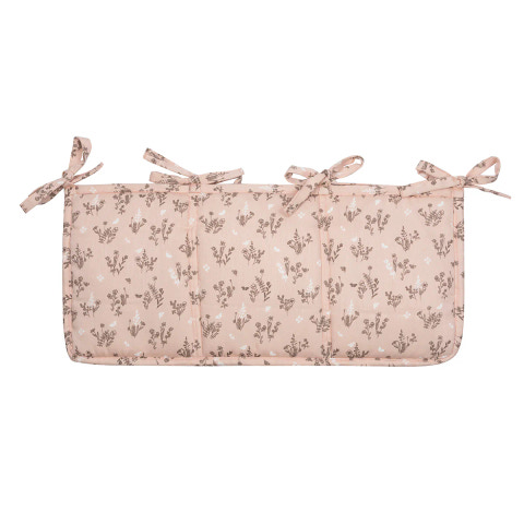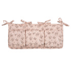 Blød og praktisk opbevaring til at hænge på sengen. Med bindebåd til fastgørelse på tremmer eller sengekant. Perfekt til pixi-bøgerne, sutter m.m. Måler 50 x 20 cm.