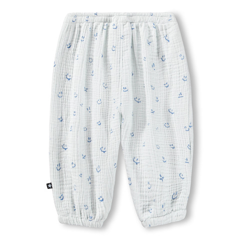 kundeservice@pixizoo.dkSerene Bukser fra Molo er et skønt valg til de mindste, der ønsker komfort og bevægelsesfrihed i hverdagen. Bukserne er fremstillet i blød bomuld, som føles behagelig mod huden og sikrer, at barnet kan lege frit hele dagen. Det fine print med små, blå smilende ansigter giver et legende og moderne udtryk, der passer til både hverdag og festlige lejligheder. Elastik i taljen og ved anklerne sørger for, at bukserne sidder godt uden at stramme, og det lette materiale gør dem perfekte til både varme og kølige dage. Molo er kendt for deres kreative designs og høje kvalitet, hvilket gør disse bukser til et sikkert valg i garderoben.