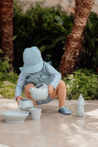 Solkasketten fra Vanilla COPENHAGEN er det perfekte valg til solrige dage, hvor dit barn skal beskyttes mod solens skarpe stråler. Den er fremstillet i let og åndbart polyester, som sikrer komfort selv på de varmeste dage. Den praktiske nakkeskygge giver ekstra beskyttelse til nakken, så barnet kan lege frit uden bekymring. Kasketten har en behagelig pasform, der sidder godt på hovedet og ikke generer under aktivitet. Det stilrene design i blå gør den nem at matche med sommerens garderobe, og den er ideel til både strand, legeplads og udflugter.