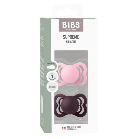 BIBS Supreme en eksklusiv sut med et bredt skjold og en symmetrisk flad dråbeformet nipple. Skjoldet er specielt designet til at sikre, at der er god luft omkring munden, så barnets følsomme hud skånes mest muligt. Skjoldet er lavet af fødevaregodkendt materiale og designet og produceret i Danmark/EU. 100% fri for BPA og ftalater. Overholder den europæiske standard EN 1400+A2. 0-6 mdr.