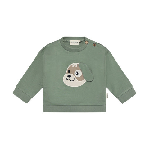 Minymo Sweatshirt - Lily Pad er en charmerende og komfortabel trøje til de mindste. Den bløde bomuldskvalitet sikrer, at barnet kan bevæge sig frit og ubesværet hele dagen. Det søde hundemotiv på fronten med en sjov 3D-øre detalje gør trøjen ekstra sjov og indbydende for børn. Praktiske trykknapper på skulderen gør det nemt at tage trøjen af og på, hvilket er en stor fordel i hverdagen. Ribkanter ved ærmer og bund sikrer en god pasform og holder trøjen på plads, selv når barnet leger og bevæger sig. Sweatshirten er perfekt til både hverdag og hyggestunder, og den flotte grønne farve passer til det meste.