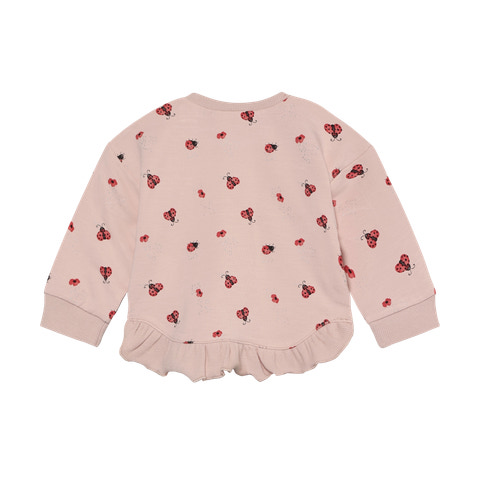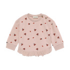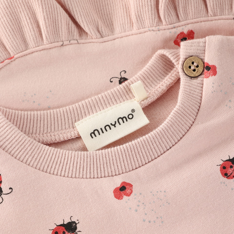 Minymo Sweatshirt m. Print - Peach Whip er en charmerende og komfortabel trøje til de mindste. Den fine lyserøde farve kombineret med et sødt mariehøneprint gør den oplagt til både hverdag og festlige lejligheder. Sweatshirten er fremstillet i en blød og behagelig kvalitet, der sikrer god komfort hele dagen. Den rynkede kant forneden tilføjer et feminint touch, mens ribkanter ved ærmer og hals sikrer en god pasform. Praktisk knaplukning på skulderen gør det nemt at tage trøjen af og på, hvilket er ideelt for både barn og forælder. Perfekt til at skabe et hyggeligt og sødt look.