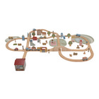 Dette store og detaljerige trætogsæt indeholder alt, hvad du behøver for timevis af kreativ leg – fra lokomotiv og vogne til skinner, broer, bygninger, biler og figurer. Der er også træer og trafikskilte, som fuldender det levende bymiljø.