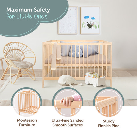 Kukka 3-trins tremmeseng, giver naturlighed og bekvemmelighed for din baby og dig. Kukka 3-trins tremmesengen, vokser med din baby og tilbyder en sikker og lang levetid med sin justerbare højde, der følger din babys udvikling. Det minimalistiske design med omhyggeligt glatte overflader og højkvalitets massivt træ uden knaster eller splinter gør, at Kukka tremmesengen passer perfekt ind i dit barns værelse.