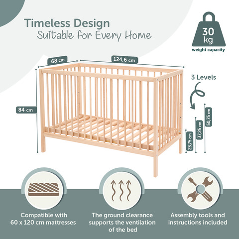 kundeservice@pixizoo.dkKukka 3-trins tremmeseng, giver naturlighed og bekvemmelighed for din baby og dig. Kukka 3-trins tremmesengen, vokser med din baby og tilbyder en sikker og lang levetid med sin justerbare højde, der følger din babys udvikling. Det minimalistiske design med omhyggeligt glatte overflader og højkvalitets massivt træ uden knaster eller splinter gør, at Kukka tremmesengen passer perfekt ind i dit barns værelse.