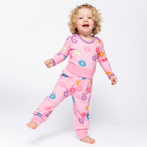 Komfortable babybukser med en frisk og farverig version af vores æble-logoprint, lavet af økologisk, strækbar bomuldsjersey for maksimal komfort. Disse OEKO-TEX Standard 100®-certificerede bukser er produceret og testet fri for skadelige stoffer, hvilket sikrer, at det er sikkert for din barnets hud og sundhed.