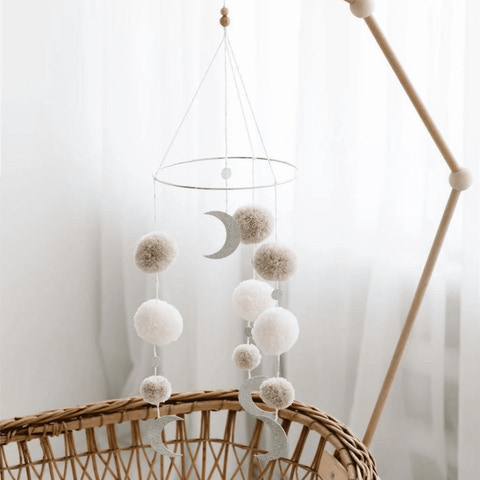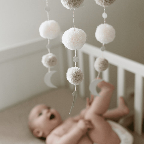 Denne smukke kombination af håndlavede uldpomponer og skinnende detaljer fanger din babys interesse for former og farver. De neutrale og pastelfarvede toner skaber en sart og elegant indretning til babyens værelse.