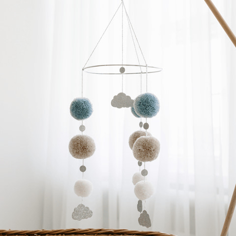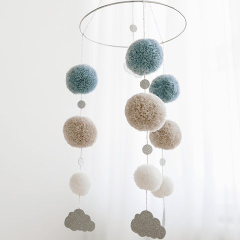 Denne smukke kombination af håndlavede uldpomponer og skinnende detaljer fanger din babys interesse for former og farver. De neutrale og pastelfarvede toner skaber en sart og elegant indretning til babyens værelse.