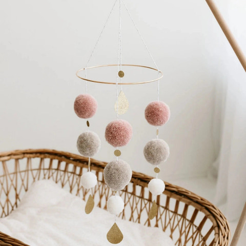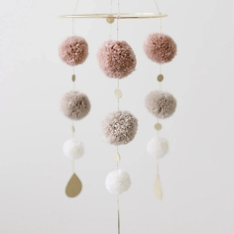 Denne smukke kombination af håndlavede uldpomponer og skinnende detaljer fanger din babys interesse for former og farver. De neutrale og pastelfarvede toner skaber en sart og elegant indretning til babyens værelse.