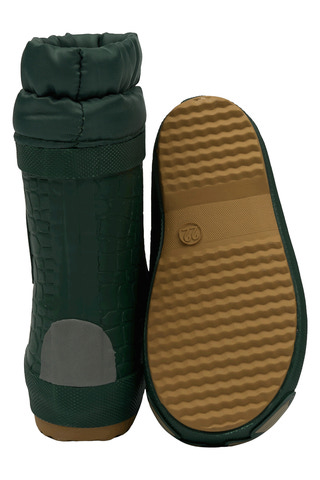 Disse mikk-line vintergummistøvler med en 3D dino patch, har lun foring og er lavet af naturlig gummi, og de er fri for ftalater. Gummistøvlerne er vandtætte, varme og praktiske til børn, der elsker at hoppe i vandpytter eller lege i vådt græs, sand eller sne.