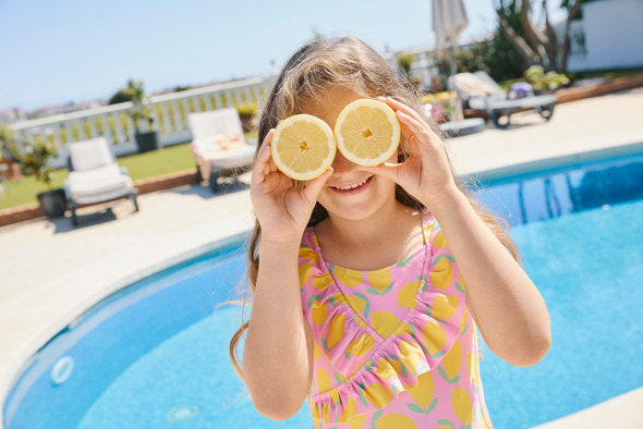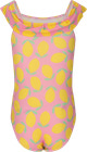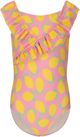 Tropical Badedragt – Lemon fra Zig Zag er en skøn badedragt, der spreder sommerstemning med sit legesyge citronmønster på lyserød bund. Den har en sød flæsedetalje foran, som giver ekstra charme, og en behagelig pasform, der gør, at barnet kan bevæge sig frit både i vandet og på stranden. Materialet er hurtigtørrende, hvilket gør badedragten praktisk til lange dage ved poolen eller havet. Perfekt til alle små badeglade børn, der ønsker både stil og komfort på solrige sommerdage!